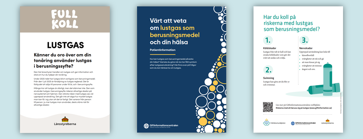Nedan finns informationsmaterial om lustgas som vänder sig till tonårsföräldrar och yrkesgrupper som kommer i kontakt med personer som använder lustgas samt sjukvården.