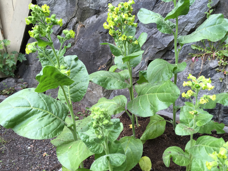 Nicotiana-arter Växten, speciellt bladen, innehåller nikotin i låg halt. Symtom: Kräkningar, blekhet, kallsvettighet och hjärtklappning.