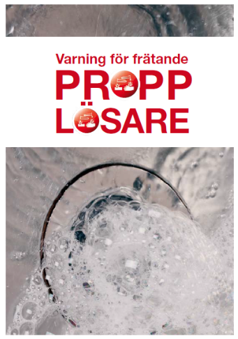 Informationsblad från Giftinformationscentralen, Kemikalieinspektionen och Arbetsmiljöverket om riskerna med frätande propplösare. Broschyren innehåller bland annat tips för att förebygga stopp i avloppet och andra alternativ för avloppsrengöring samt råd för första hjälpen om olyckan är framme.